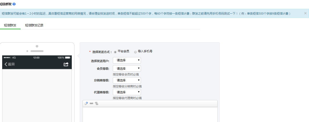站内信群发增加选择代理商等级 操作步骤: 总部后台→营销→消息群发:站内信群发增加选择代理商等级。